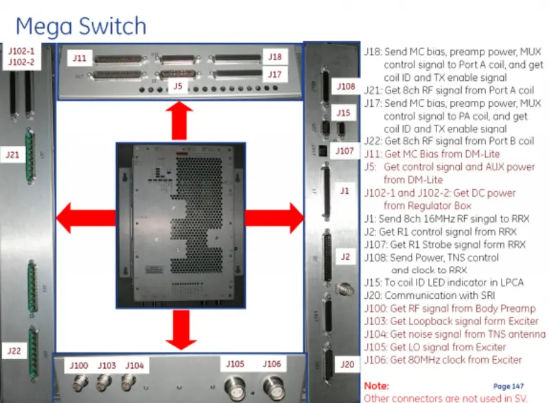 SRI కమ్యూనికేషన్ (J20): SRI ఎక్స్‌టర్నల్ సిగ్నల్ ఇన్‌పుట్‌లతో డేటా మార్పిడిని ప్రారంభిస్తుంది (J100, J103-J106): బాడీ ప్రీయాంప్ నుండి RF సిగ్నల్‌లు, ఎక్సైటర్ నుండి లూప్‌బ్యాక్ సిగ్నల్‌లు, TNS యాంటెన్నా నుండి నాయిస్ సిగ్నల్‌లు, LO సిగ్నల్స్ మరియు ఎక్సైటర్ నుండి 80 MHz గడియారాన్ని స్వీకరించండి